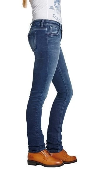 Die neue ROKKER Jeans für Damen in Blau: „Rokkertech Pant Lady“ aus einlagiger UHMWPE Faser gefertigt, die derzeit als die stärkste Faser der Welt gilt. Bequeme Slim Fit Passform durch Stretch-Einlage. Zusätzlich Taschen für nachrüstbare Protektoren vorbereitet.